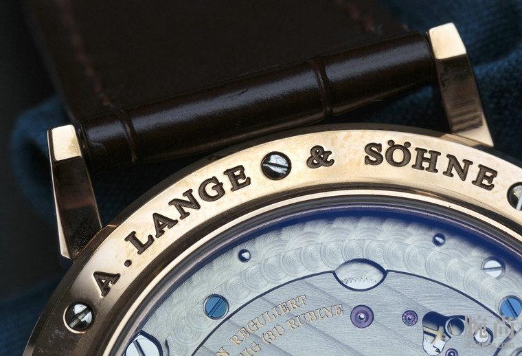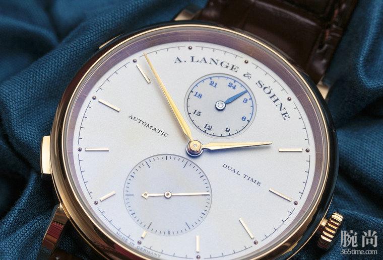 很多人都喜欢朗格采用的蓝钢实心表针的设计。金针和蓝钢针对比也非常明显,易于辨识。表盘的表面处理也是完美的,两个小表盘和主表盘之间的小反差让人很喜欢。 你会注意到,为了保持平衡,表盘中间左右文字是AUTOMATIC 和 DUAL TIME,不知你注意到了吗?包括空格在内,两边字母数字相同,这就能保持表盘平衡之美!