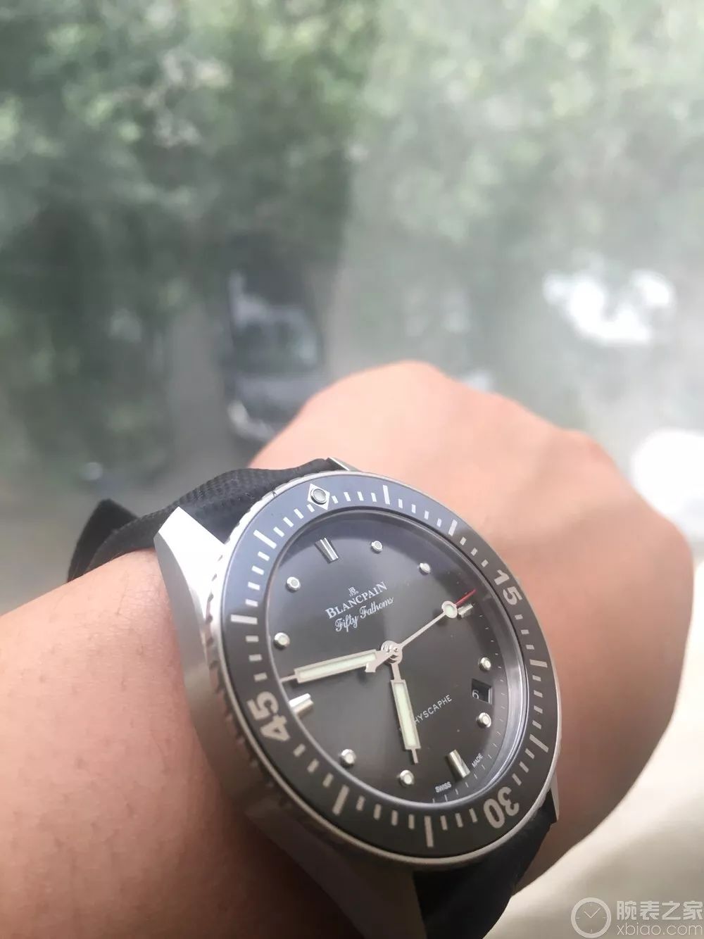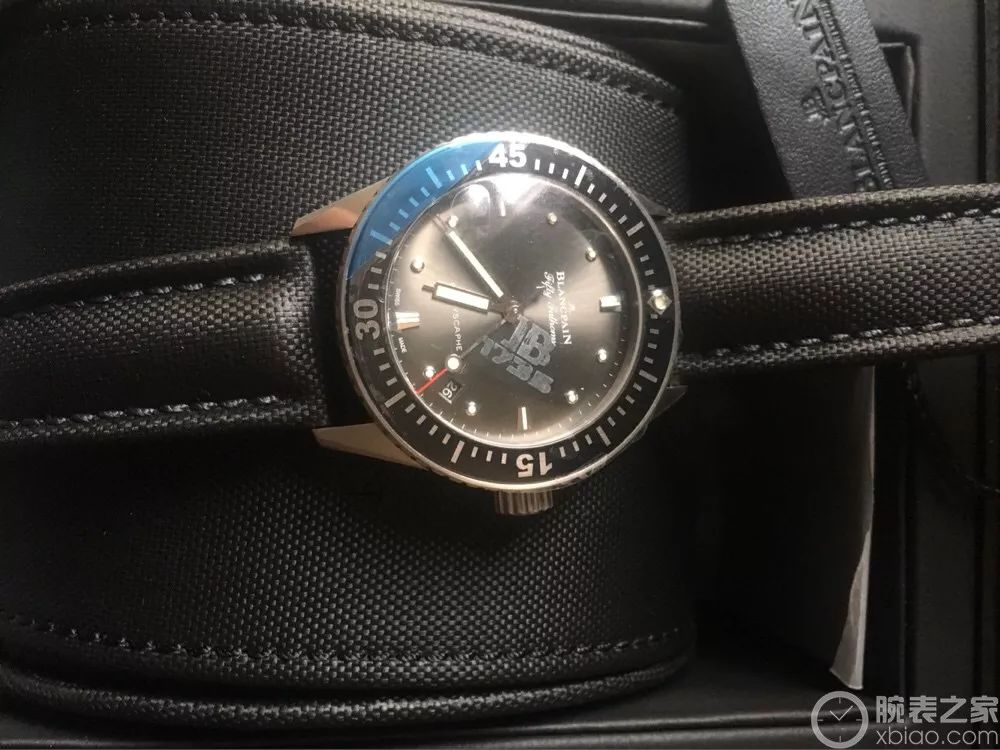 刚刚入完劳力士114300,又开始蠢蠢欲动了。最近几年非常流行潜水表,跑过专柜试过水鬼,43的五十噚,都无法驾驭,只因本人手腕比较细,苦逼啊,在宝珀上海专柜试表的时候店员告诉我有一款38的应该适合你,我喜出望外,最后又说可惜没货,又掉入冰底。 离开了专柜,还是心心念念店员所说的话,随后微信联系,对方说可以帮忙问问,一天后答复我,可以订货,2个月左右,对于我这种急性子来说简直是灭顶之灾啊,而且也有顾虑,毕竟没上过手,不知道效果如何。 就这么过去了一个礼拜,说巧真是巧,业务上需要给客户送礼,对方指定的竟然也是这款礼物,不过是蓝色的,这回好了,我得找两块了,通过各个朋友找,终于功夫不负有心人,在香港的一个角落找到一款蓝色的,三天后朋友带回来,上手了一下(忘了拍照了,晕)这回彻底种草了,真适合我啊。 表送出去了,我的欲望更强了,又托全世界的朋友找,一周下来回复只有大表盘的,这回郁闷了,正当准备放弃之时,有个朋友找到现货,二话不说直接预定,感谢朋友看我的流水账,下面上图