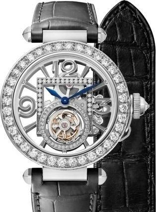 Ballon Bleu de Cartier卡地亚蓝气球超薄腕表,40毫米表款,卡地亚430 MC型工作坊精制手动上链机械机芯。18K镀铑白金表壳,镶嵌145颗明亮式切割圆钻,总重1.19克拉。凹槽式表冠,镶嵌一颗凸圆形蓝宝石,镀银阳光射线纹饰漆面表盘,剑形蓝钢指针。蓝宝石水晶镜面。半哑光黑色鳄鱼皮表带,18K镀铑白金折叠表扣。表壳尺寸:直径:40毫米。厚度:6.9毫米。防水深度约30米。 PASHA DE CARTIER腕表1943年问世的一款卡地亚圆形防水腕表启发了Pasha系列的诞生。圆形防水表壳,4枚阿拉伯数字时标,通过短链固定于表壳的旋入式表冠,剑形指针,结合而成一款与众不同的时计,彰显优雅与力量。Pasha腕表由此成为卡地亚制表世界中一款独特的隽永之作。 【9】HPI01435 41毫米表款,手动上链机械机芯,18K白金,镶嵌钻石,两条可替换式皮表带