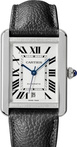 Tank Louis Cartier蓝宝石水晶镂空腕表,尺寸30 x 39.2毫米,搭载卡地亚9616 MC型工作坊精制手动上链机械机芯。18K白金表壳;18K白金圆珠形表冠,镶嵌一颗凸圆形蓝宝石,剑形蓝钢指针。黑色鳄鱼皮表带,配18K白金折叠表扣。 镂空设计 ,时、分、小秒针显示。机芯带独立编号,含159个零件,其中包括21枚红宝石轴承。机芯总尺寸:26 x 26.3毫米,机芯厚度:3.6毫米,摆轮振频:每小时28,800次;动力储存:约3日。蓝宝石水晶镜面和蓝宝石水晶透明表背。表壳厚度:7.45毫米。防水深度30米。 TANK SOLO腕表简洁低调的现代设计,Tank Solo腕表自诞生之日便成为了经典。在保留令Tank腕表系列大获成功的独特美感的同时,Tank Solo腕表在款式方面提供了许多变化。 Tank Solo腕表,超大号表款,自动上链机械机芯。精钢表壳,圆珠形表冠,镶嵌一颗凸圆形合成尖晶石,镀银珠光表盘,罗马数字时标,剑形蓝钢指针,蓝宝石水晶镜面。