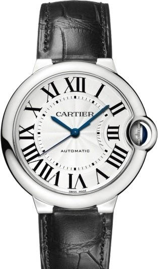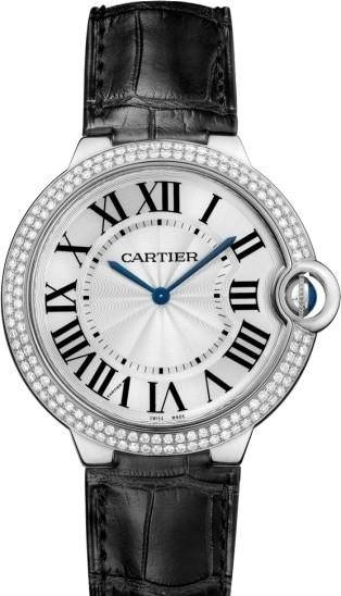 Ballon Bleu de Cartier卡地亚蓝气球腕表,36毫米表款,自动上链机械机芯。精钢表壳,凹槽式表冠,镶嵌一颗凸圆形合成尖晶石,镀银珠光扭索雕纹表盘,罗马数字时标,剑形蓝钢指针,蓝宝石水晶镜面,鳄鱼皮表带,精钢折叠表扣。表壳尺寸:直径:36.6毫米。厚度:12.05毫米。防水深度30米。 【7】WSBB0020 37毫米表款,自动机芯,精钢,皮表带