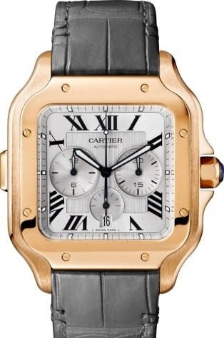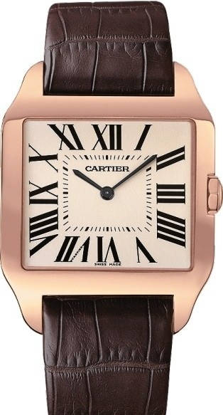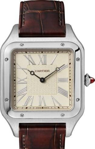 Santos-Dumont“La Demoiselle”腕表,XL号表款,卡地亚430 MC型工作坊精制手动上链机械机芯。铂金表壳,圆珠形表冠镶嵌一颗凸圆形红宝石,米白色表盘,罗马数字时标,苹果形黑色精钢指针,隐秘“Santos”字样,蓝宝石水晶镜面。可替换巴拿马编织表带和棕色鳄鱼皮表带,两枚铂金针扣式表扣。底盖镌刻“淑女号”飞行器(La Demoiselle)设计图。编号并限量发售30套。表壳尺寸:46.6毫米 x 33.9毫米。厚度:7.5毫米。防水深度约30米。 【12】WGSA0017 超大号表款,自动机芯,18K玫瑰金,可替换式皮表带与橡胶表带