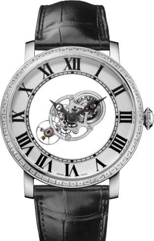 Rotonde de Cartier Astromystérieux天体运转式神秘陀飞轮腕表,43.5毫米表款,卡地亚9462 MC型工作坊精制手动上链机械机芯。950‰铂金表壳,950‰铂金表圈,镶嵌60颗梯形切割钻石,总重2.36克拉,950‰铂金圆珠形表冠,镶嵌一颗明亮式切割圆钻,重0.14克拉,阳光射线纹饰扭索雕纹表盘,苹果形指针。黑色鳄鱼皮表带,18K白金折叠表扣,镶嵌37颗梯形切割钻石,总重0.85克拉。Astromystérieux神秘天体复杂功能:神秘中置陀飞轮,由擒纵机构、摆轮、主轮系和发条盒组成,1小时内旋转完一整圈。机芯带独立编号,由408枚零件组成,包括188枚滚珠轴承及25枚红宝石轴承。机芯直径:39毫米,机芯厚度:5.9毫米,摆轮振频:每小时21,600次,动力储存:约50小时。蓝宝石水晶透明表背。表壳厚度:12毫米。防水深度约30米。 更多腕表知识请关注微信公众号《小猪制表》在线服务 |