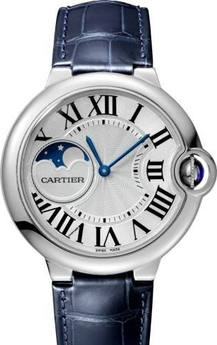 Ballon Bleu de Cartier卡地亚蓝气球腕表,37毫米表款,自动上链机械机芯,月相显示。精钢表壳。镀银雕纹表盘,罗马数字时标,9时位置月相显示,剑形蓝钢指针。蓝宝石水晶镜面。蓝色鳄鱼皮表带,搭配精钢折叠表扣。表壳厚度:13毫米。防水深度约30米。