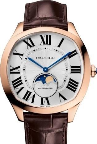 Drive de Cartier月相腕表,卡地亚1904-LU MC型工作坊精制自动上链机械机芯。18K玫瑰金表壳,长度:40毫米,宽度:41毫米,厚度:12.15毫米,18K玫瑰金八角形表冠,镶嵌一颗多切面蓝宝石。镀银雕纹表盘,罗马数字时标,剑形蓝钢指针。蓝宝石水晶镜面。半哑光棕色鳄鱼皮表带,18毫米18K玫瑰金折叠表扣。6时位置设月相显示,蓝宝石水晶透明表背。防水深度约30米。 BALLON BLEU DE CARTIER卡地亚蓝气球腕表如气球般轻盈,如其守护的凸圆形宝石般湛蓝,Ballon Bleu de Cartier卡地亚蓝气球腕表为男士与女士的袖口腕间平添了一份优雅。罗马数字时标在深邃的幽蓝表冠指引下偏离了轨迹。凸面弧形表壳,扭索雕纹表盘,剑形指针,搭配抛光或磨砂链节表链……在卡地亚制表世界中,Ballon Bleu de Cartier卡地亚蓝气球腕表以风格细腻,格调高雅著称。 【6】W69017Z4 36毫米表款,自动机芯,精钢,皮表带
