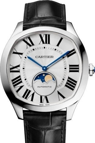 Drive de Cartier月相腕表,卡地亚1904-LU MC型工作坊精制自动上链机械机芯。精钢表壳,长度:40毫米,宽度:41毫米,厚度:12.15毫米,精钢八角形表冠,镶嵌一颗多切面合成尖晶石。镀银雕纹表盘,罗马数字时标,剑形蓝钢指针。蓝宝石水晶镜面。半哑光黑色鳄鱼皮表带,18毫米精钢折叠表扣。6时位置设月相显示,蓝宝石水晶透明表背。防水深度约30米。 【5】WGNM0008